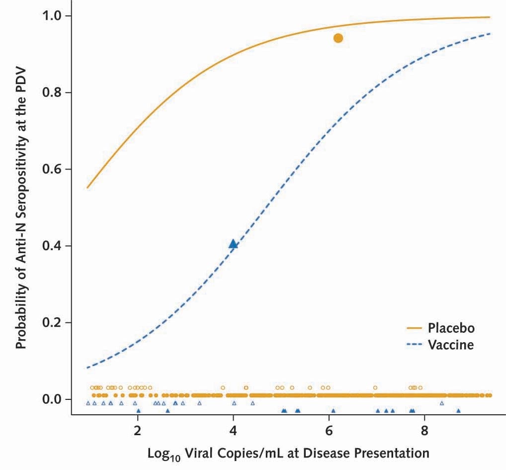The chart shows the probability of a “Anti-N serology test” being positive during the Moderna vaccine trial and the bottom line is that at for most infections (other than the most severe, so about 95% of all recorded infections in the trial) the chance of testing positive on a Anti-N serology test was 2.3x lower (93% vs 40%) in the vaccinated group.