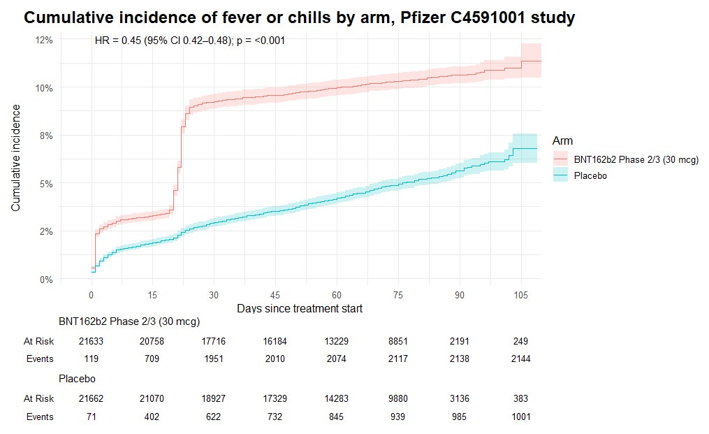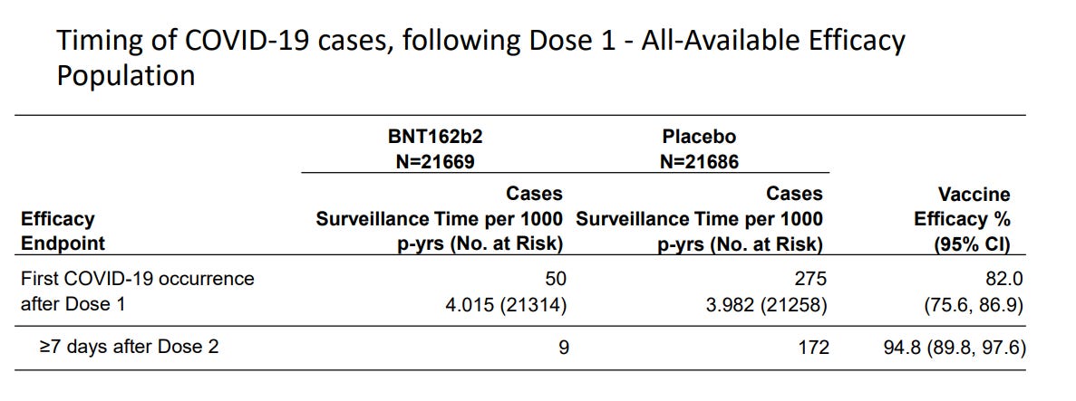 You can see that the numbers match the provided data (275 vs 50 cases) so that’s a good sanity check and in fact we can recreate the “days from dose 1” graph from the same data11, just to confirm that we have the correct data.