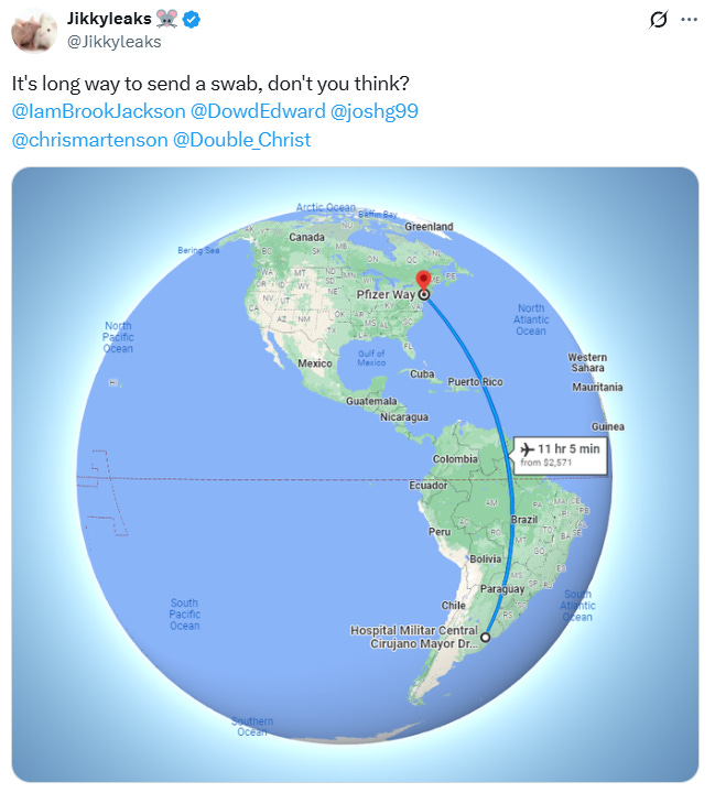 The tweet is basically asking why - when a large proportion of the trial participants were recruited in Argentina - you would send your “suspected COVID” swab all the way to New York.