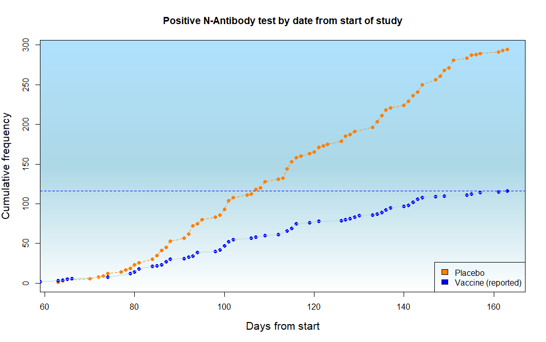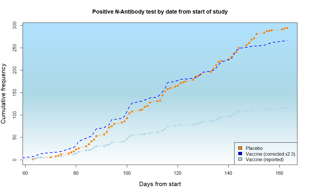 What that graph shows is that, even according to Pfizer’s own data, the antibody-documented infection rate in both arms was pretty much the same.