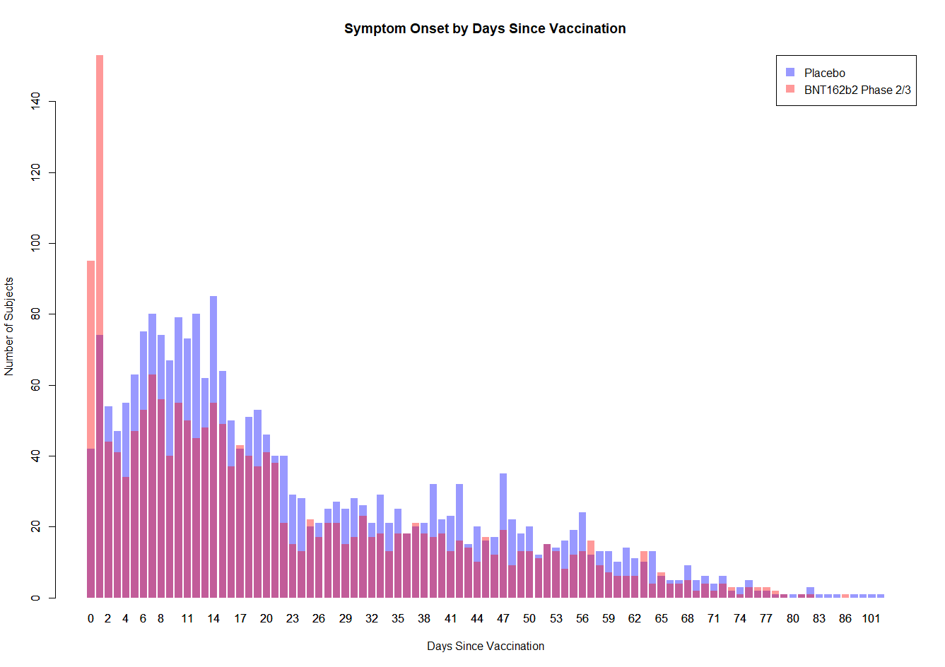 And if you want to compare these “symptoms” you can see clearly from this graph that the first week is worse for the vaccinated and then over time the placebo group sort of do worse - but it’s probably not enough to make up for the first week’s disaster.