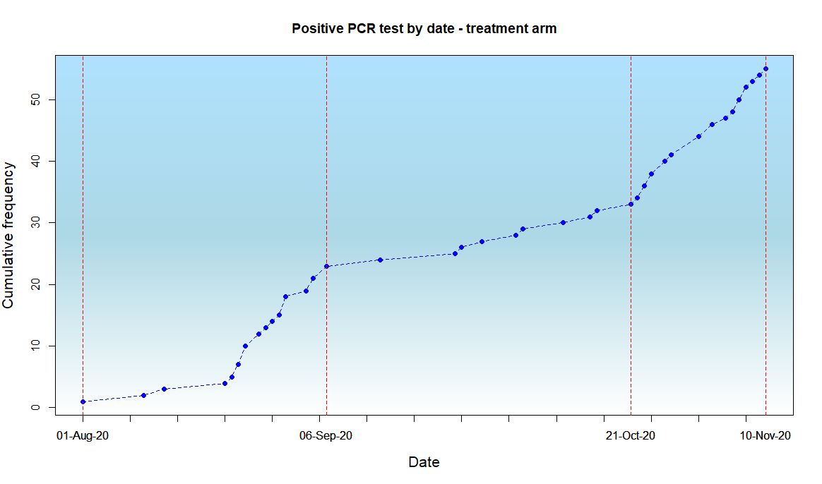 I have done similar graphs but can't work put how to share. If you track the two arms by the datum how long they had been in the study that looks pretty suspect . Also all the date of tests gives an insight as apparently they weren't running test on weekends (weirdly) and most of the silummer there was little virus about