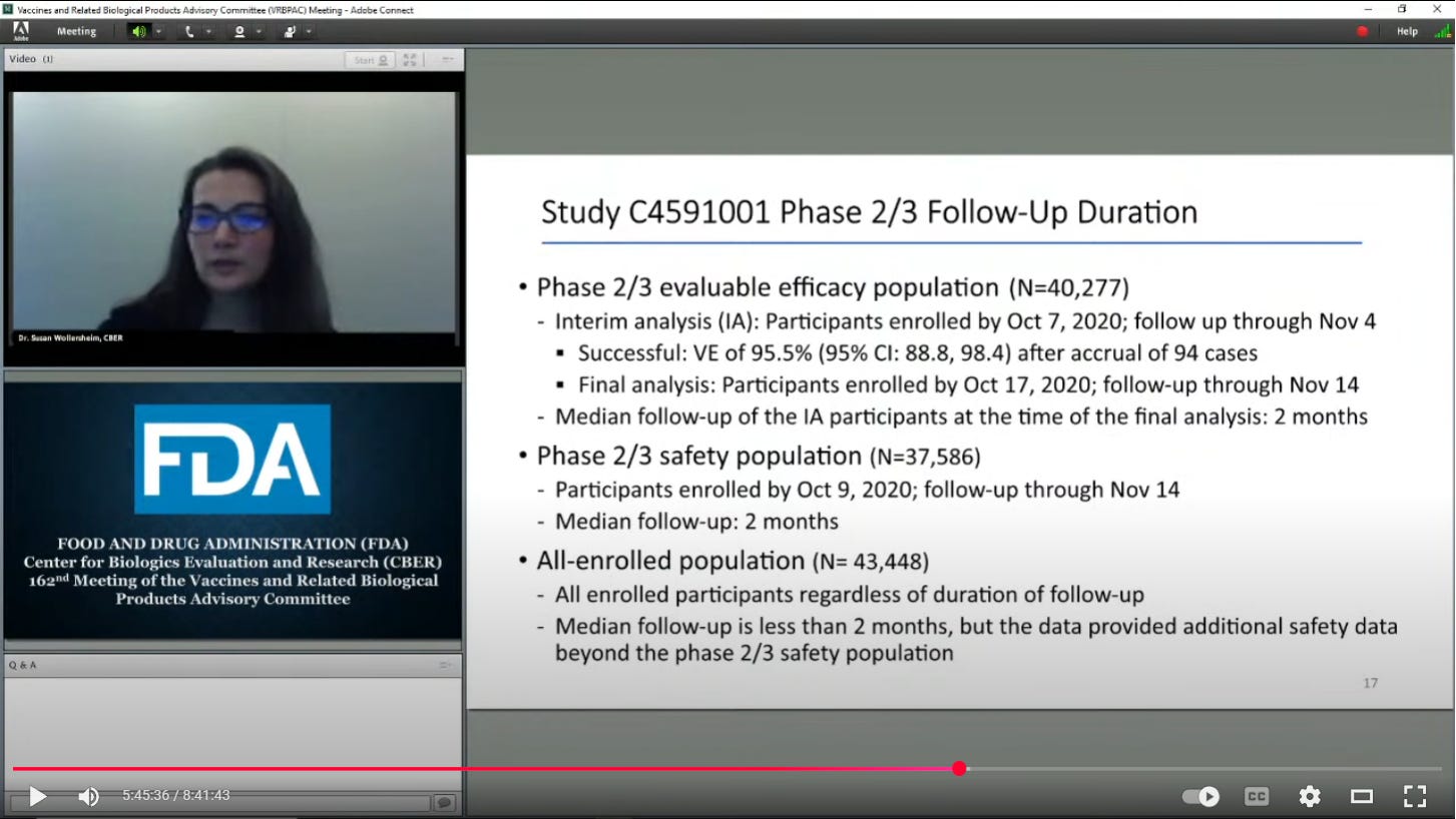Here she is with her blue light filter glasses8 on noting that the FDA also had the inside information on the fabulous “95% efficacy” figure in October.