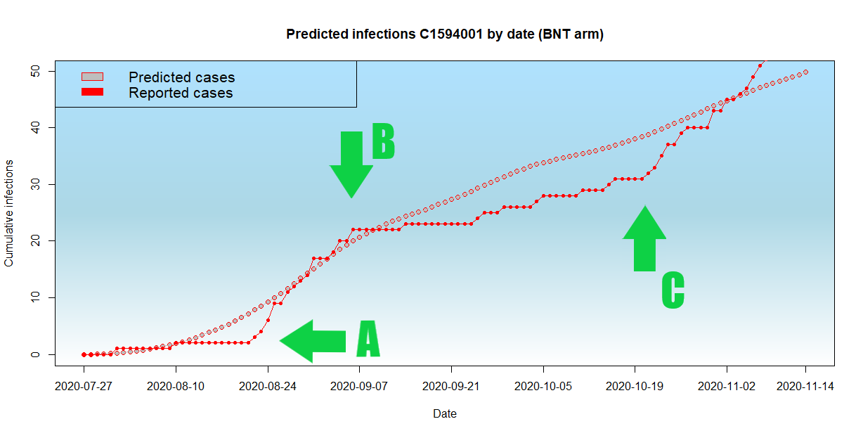 You can perform statistical tests to show that the accumulation of cases in the period 6th Sept - 21st October was anomalous by comparing the number of cases in this time between the groups (chisquare test 10/54 vs 122/272, p<0.001) or comparing the cases that arose in this time period to the model (Fisher test 9/55 vs 23/61, p=0.013) . The numbers vary slightly depending on the model or the Pfizer file used.